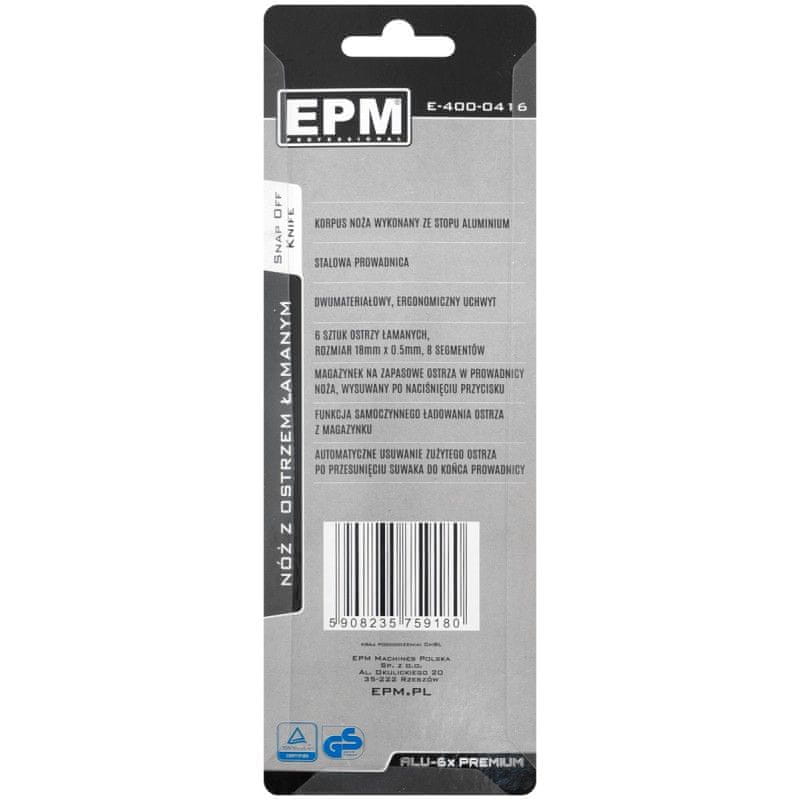 NOŽ, NOŽ Z ODLOMLJIVIM REZILOM ALU-6X PREMIUM 18 MM + 6 REZIL – E-400–0416 Celoten opis