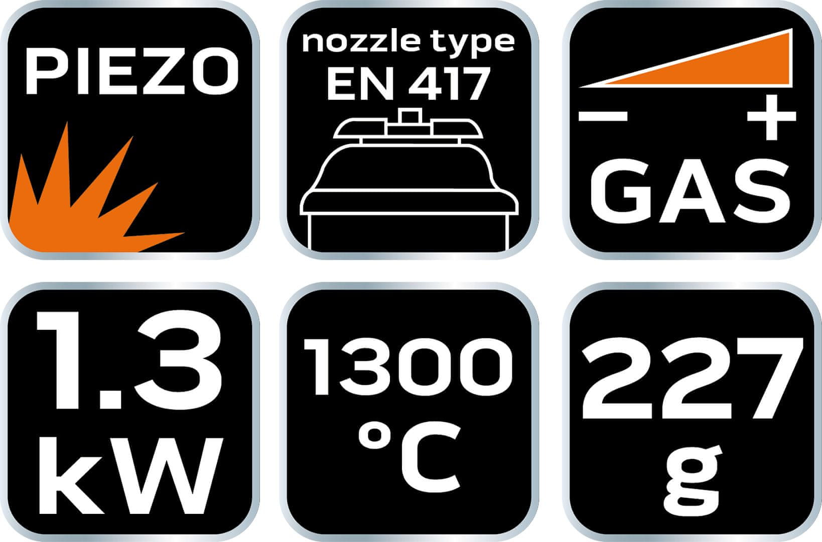 Plinski gorilnik z navojem NEO 20–041 + plinska kartuša z butanom, 227 g, je komplet praktičnega gorilnika in ene same kartuše EN 417 s težo 227 g. Naprava doseže delovno temperaturo 1300 °C in moč 1,11 kW. Gorilnik se lahko uporablja navpično (+/- 80 stopinj). Opremljen je s praktičnim piezo vžigom za hiter vžig. Kartuša je vsestranska, primerna na primer za uporabo v gorilnikih in kamping štedilnikih. Ta celovit komplet NEO je priporočljiv za vsakodnevno uporabo in v nujnih primerih.