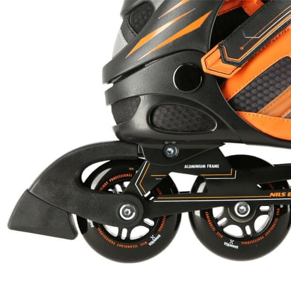 Rolerji NILS Extreme NA14112 so namenjeni rekreativni vožnji srednje in naprednih rolarjev po ravnih in gladkih poteh, kot je asfalt. Polmehak, lahek in trpežen čevelj je izdelan iz kombinacije MESH mreže in EVA pene, konica je opremljena z luknjicami za prezračevanje, te lastnosti zagotavljajo zračnost čevlja, zmanjšujejo potenje nog in tako preprečujejo močenje vložka. Prezračevalni sistem in oblikovan vložek čevlja tako neposredno vplivata na povečanje udobja uporabnika. Okostje modela NH14112 je izdelano iz polipropilena, ki je zelo trpežen in zdrži tudi najtežje padce, hkrati pa stabilizira stopalo v predelu gležnja. Varnost drsalke poveča dvodelno zapenjanje na zaponko, trak ježka in vezalke. Poliuretanska kolesa s trdoto 82A se dobro oprimejo podlage in so nameščena v aluminijasto kletko iz enega samega kosa aluminija, ki je pod visokim pritiskom vbrizgan v kalup. Model NA14112 je opremljen z ležaji ABEC 9, za katere je značilen