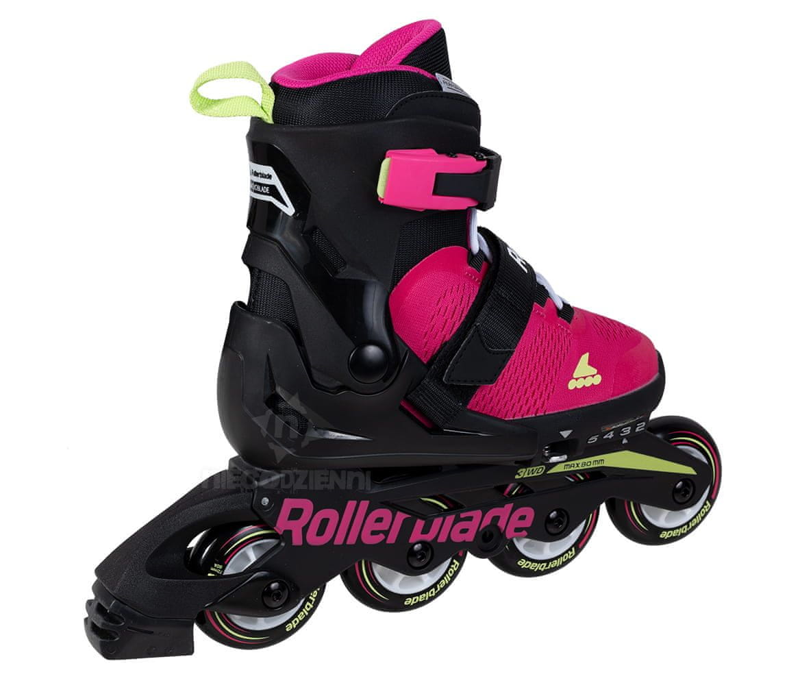 MIKROBLADETo so otroški rolerji z nastavljivo velikostjo. Kompozitni okvir 3WD/4WD omogoča klasično 4-kolesno nastavitev ali rahlo inovativno 3-kolesno nastavitev. Popoln za učenje, rekreativno drsanje in zahtevnejše drsanje. Podloga je dobro zračna in se popolnoma prilagaja otroški nogi. Primerno za začetnike, mlade drsalce vseh stopenj znanja.