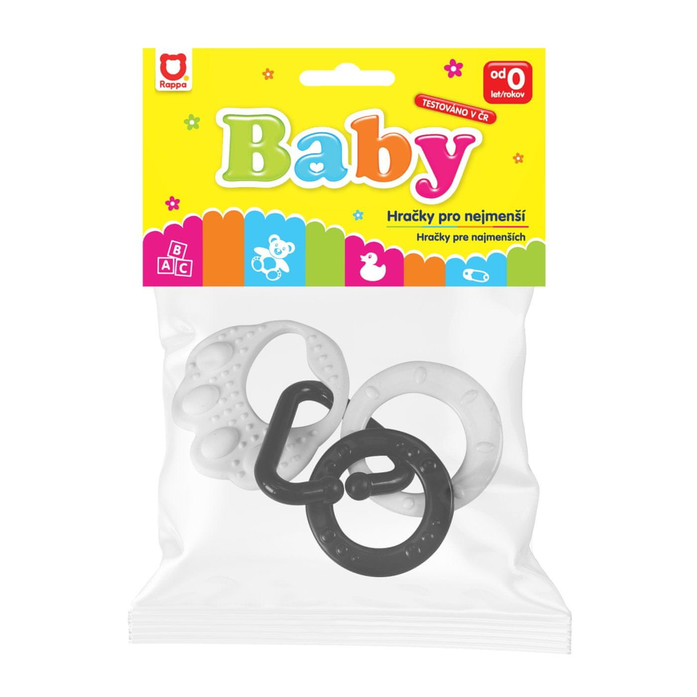 Črno-bela grizalka odlično spodbuja vid pri otroku, ki še ne razlikuje barv. Na tački so obešene plastične oblike v različnih vzorcih, bodisi v obliki kolesa, srca, zvončka itd.