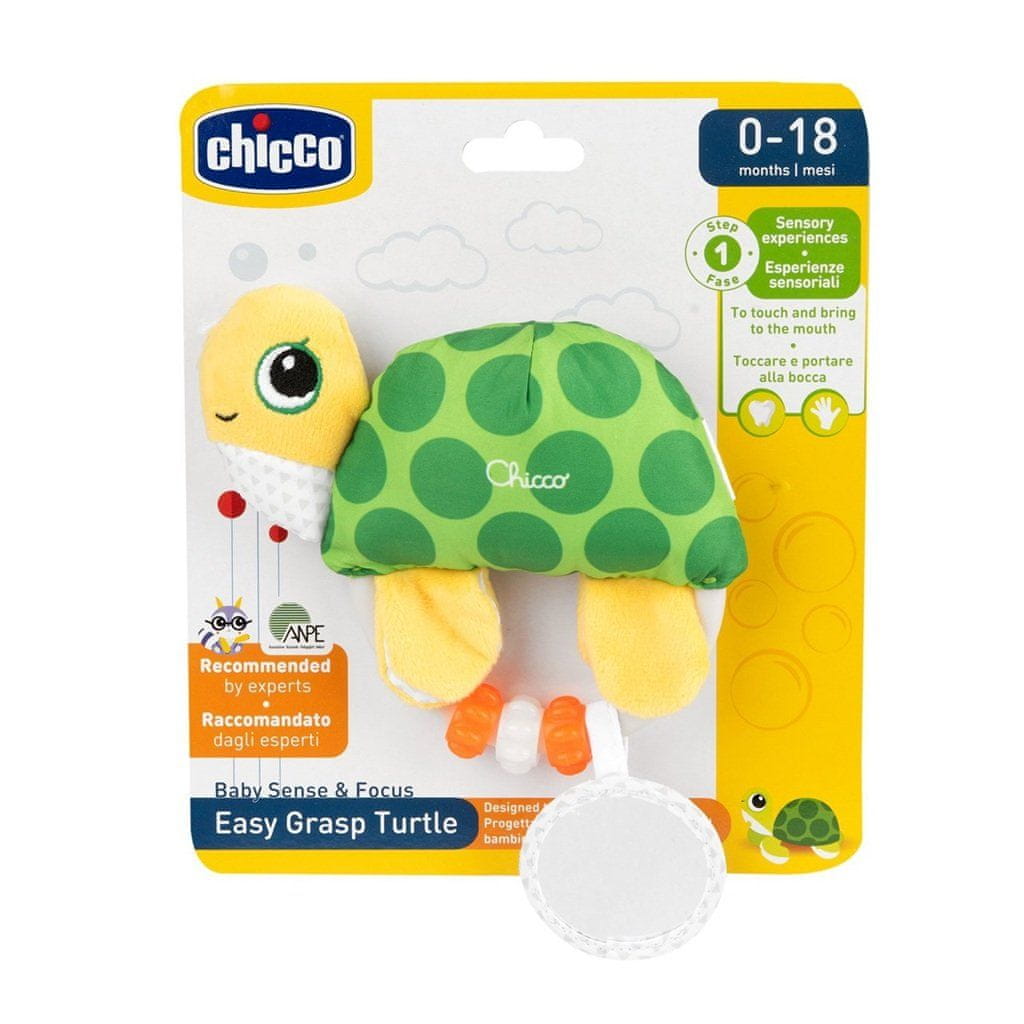 Prikupna želva ponuja številne dražljaje za dojenčka: mehko telo z ropotuljicami, ogledalo, ki ustvarja svetlobne učinke, in plastični ročaj z drsnimi obročki. Ročaj omogoča enostaven oprijem, zato je idealna za najmlajše. Pomaga pri razvoju taktilnih in vizualnih spretnosti.