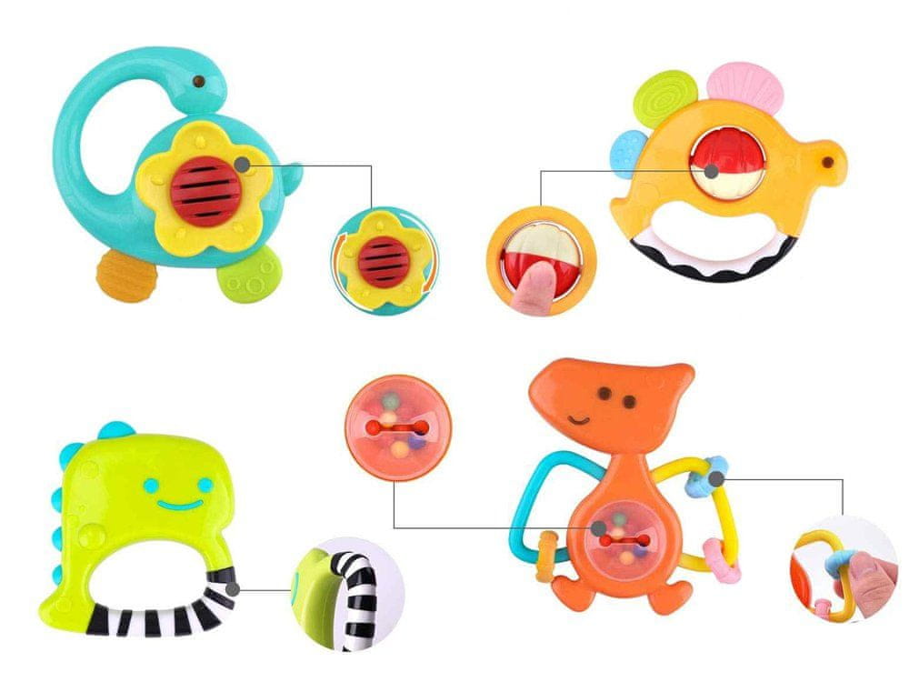 Čudovit komplet 5 pisanih ropotuljic in grizalje namenjen najmlajšim otrokom, ki pravkar odkrivajo svet.