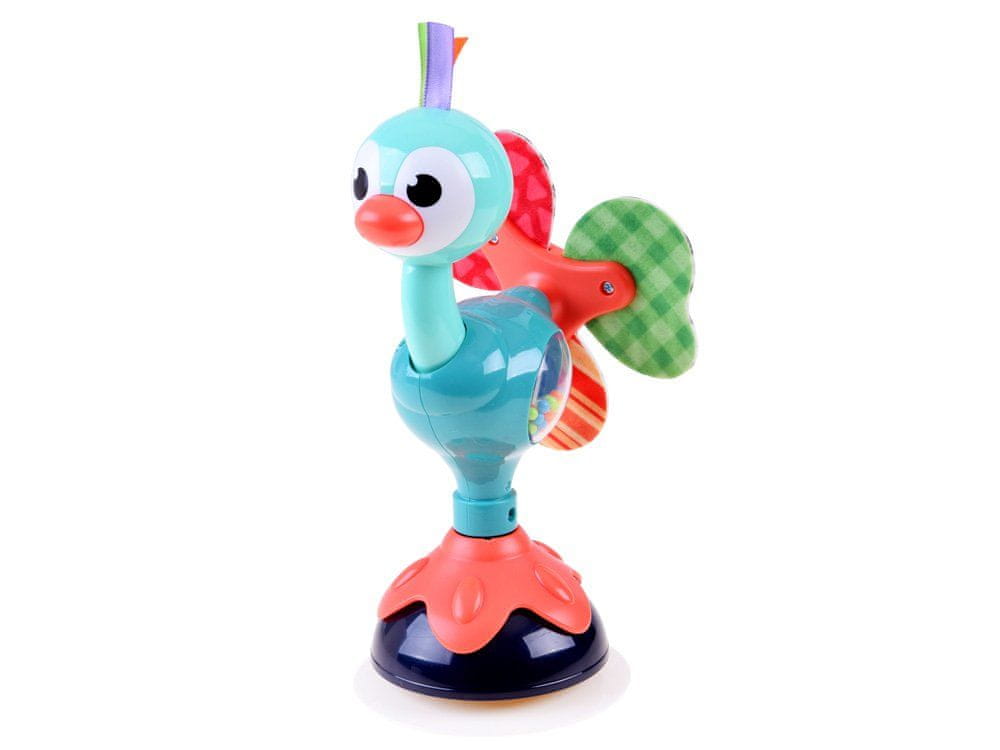 Čarobno obarvana pavova ropotuljica na prisesku je popolna igrača za najmanjše dojenčke. Igrača je v celoti izdelana iz plastike z dodatki iz blaga (pavov rep), ima gumijast prisesek, ki ga je mogoče enostavno pritrditi na ravno, gladko površino mize, tal ali stola za hranjenje.