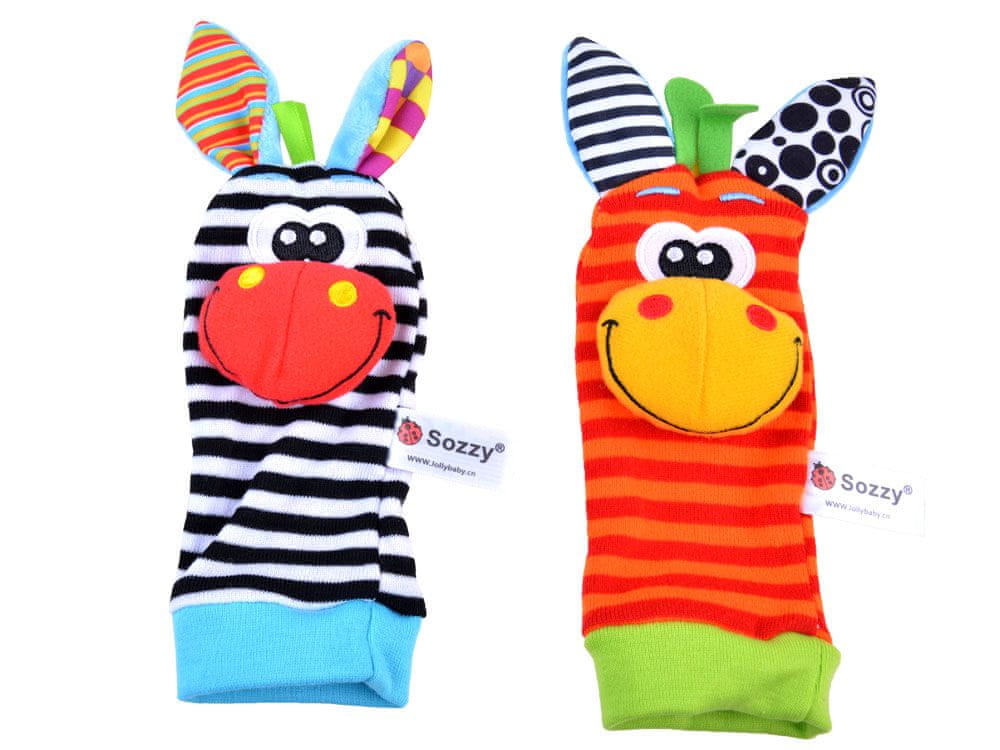 Ščipalke so izdelane iz mehkega pliša v intenzivnih barvah s črnimi in belimi kontrastnimi vložki. V gobcu vsake živali je skrit zvonček, ki prijetno zadoni, ko otrok premakne roko ali nogo. Ušesca šumijo, kar otroka spodbuja, da jih lovi in premika.Barvite značke pomagajo pri urjenju otrokovih ročnih spretnosti. Malček ima tudi priložnost raziskovati različne teksture materialov.