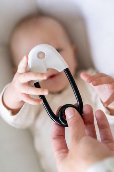 Grčalec je klasična otroška igrača, ki je vaš otrok ne sme zamuditi. Idealna je za otrokove prve poskuse držanja igrače. Je enostavna za prijemanje, zelo lahka, kontrastna oblika pa bo zagotovo pritegnila otrokovo pozornost. Spodbuja razvoj otrokovih finih motoričnih spretnosti in čutnega zaznavanja. Zaradi majhnih kroglic v notranjosti nežno hrešči. Velikost zatiča: 12 cm Velikost paketa: 12 × 19 cm Primerno za otroke od rojstva dalje