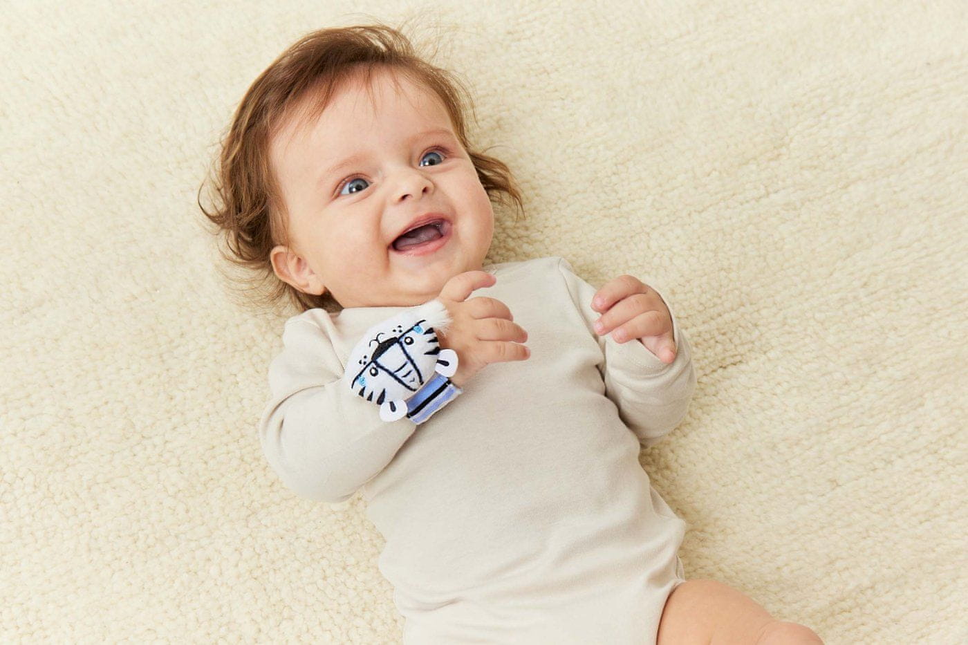 Kdor ima ušesa, naj posluša … Kot vemo, imamo ljudje par ušes že od samega začetka, toda kateri zvoki so najprimernejši za našega malčka? Naša ropotuljica s plišastima glavama tigra in psička je odlična rešitev, ki aktivira otrokova čutila že od rojstva. ropotuljica GaGaGu aktivira sluh – zvok ropotuljice je mehak in prijeten (ne preglasen). Grizalo ima kontrastne barve in vzorce, ki spodbujajo dojenčkov vid. Plišaste glave živali – tigra in psa – spodbujajo otroke, da jih ujamejo, ter spodbujajo vadbo tako imenovane fine motorike (gibanje prstov in rok) in učenje motorične koordinacije. Hrkalo lahko pritrdite na zapestje (s posebnim velcro trakom, brez ostrih dlačic, zlahka ga pritrdite) in ga uporabljate kot običajno hrkalo, saj je trak narejen iz mehkega materiala in tako otroku omogoča, da udobno zajame celotno igračo. Starost 0+