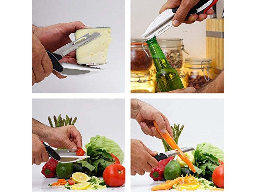Prihranite čas pri rezanju in razdeljevanju sestavin na porcije – uporabite 6v1 Clever Cutter, pameten škarjasti rezalnik, s katerim lahko obdelate vse vrste zelenjave, mesa, kruha ali sira veliko hitreje kot staromoden nož in deska za rezanje.