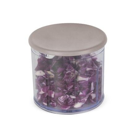 Kompakten in zmogljiv električni sekljalnik 2 v 1 v elegantni mat sivo-rjavi barvi je praktičen pomočnik za vsako kuhinjo. Zahvaljujoč dvojnemu rezilu lahko enostavno seklja zelenjavo, zelišča in oreščke. Pokrov omogoča uporabo posode za neposredno shranjevanje hrane.