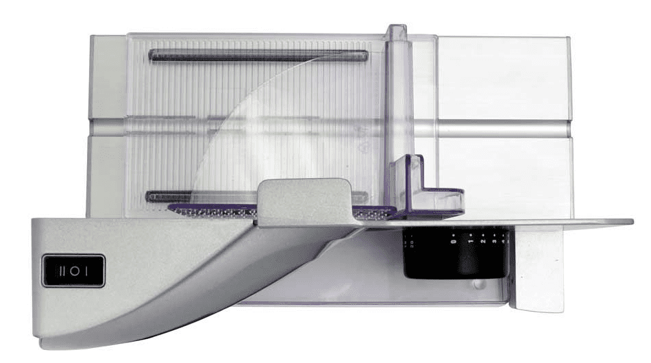 Vedno popolne rezine! Rezalnik omogoča izbiro med debelinami rezanja od 1 do 20 mm. Kot oblate mehke fileje razreže prav tako hitro in enostavno kot čvrst polnozrnat kruh. Varnost ni zanemarjena: praktično držalo za ostanke in varnostno stikalo zagotavljata, da se vaši prsti ne ujamejo med rezilo i Celoten opis