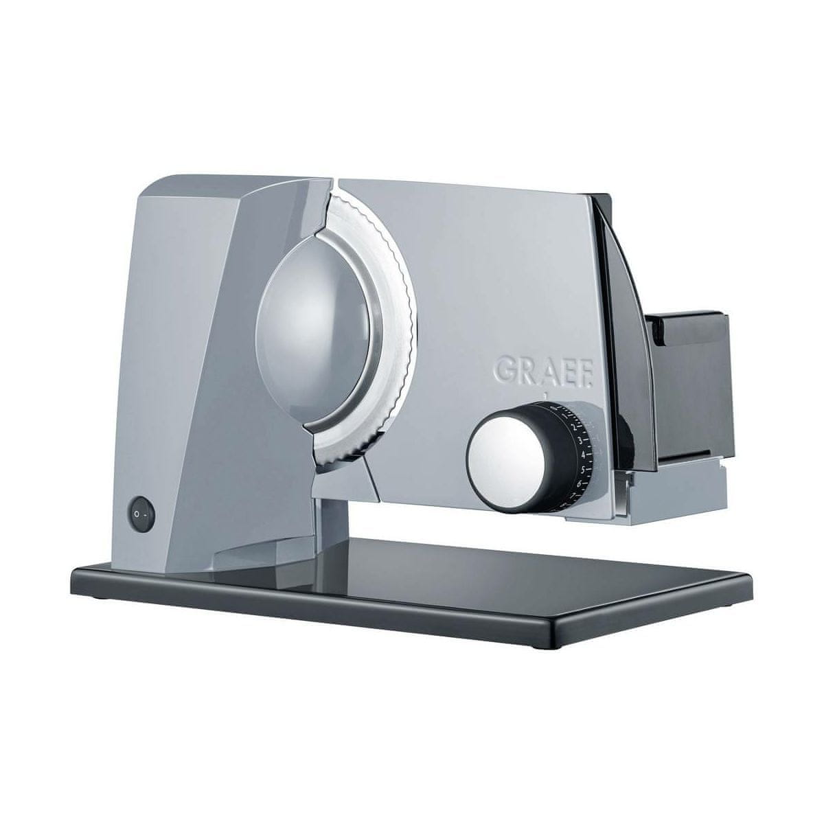 Kompaktni rezalnik hrane GRAEF SKS 110 v elegantno svetlo sivi barvi in nazobčanim rezilom.