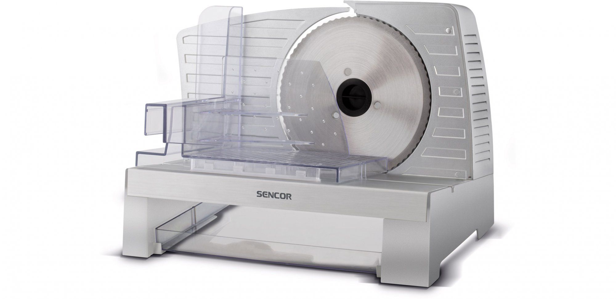 Električni rezalnik hrane z vhodno močjo 100 W. SENCOR SFS 3050SL odstranljivi disk za rezanje iz nerjavečega jekla s premerom 17 cm, rotacijski regulator za brezstopenjsko nastavljanje širine rezanja in odstranljivi pomik z zaustavitvijo v obe smeri. Popolnoma raztegnjen podajalnik za rezanje večjih živil. Celoten opis
