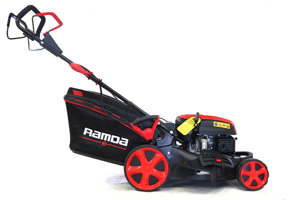 Ramda G46SHLE-B1 4v1 samohodna bencinska kosilnica z 2,6 kW moči, 65-litrskim košem in 4v1 načinom košnje: koš, mulčer, izmet zadaj in stranki izmet. Celoten opis