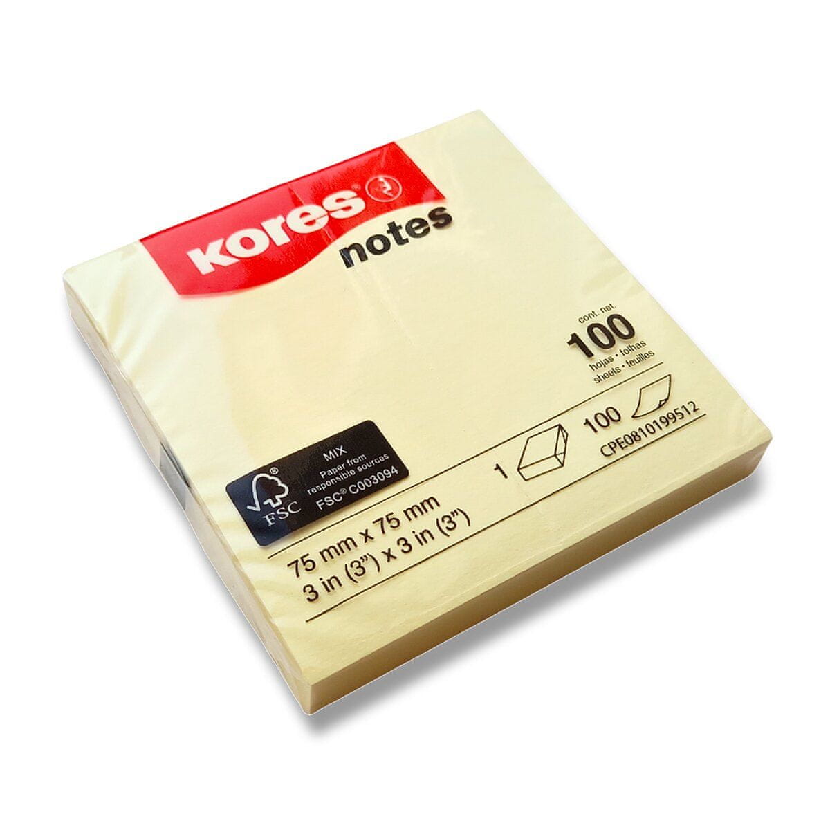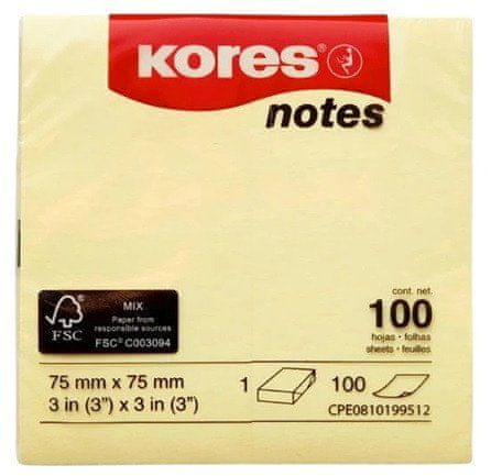 Kores Samolepilni beležni blok - rumen - 75 × 75 mm, 100 listov