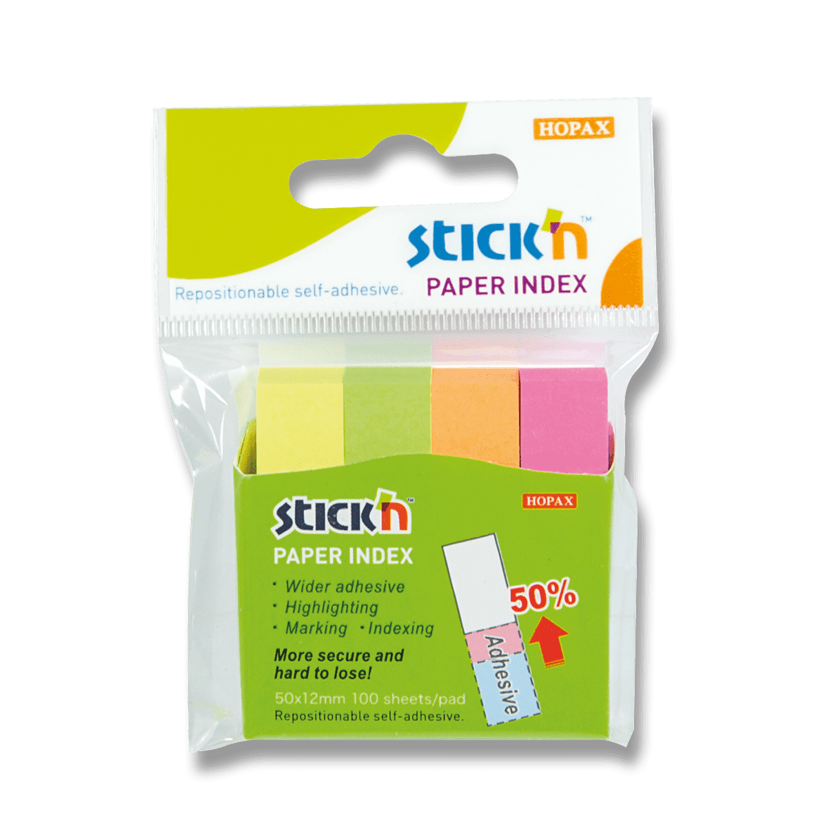 Samolepilni papirnati zaznamki v neonskih barvah. Majhen, velikost 50 × 12 mm, 4 × 100 listov.