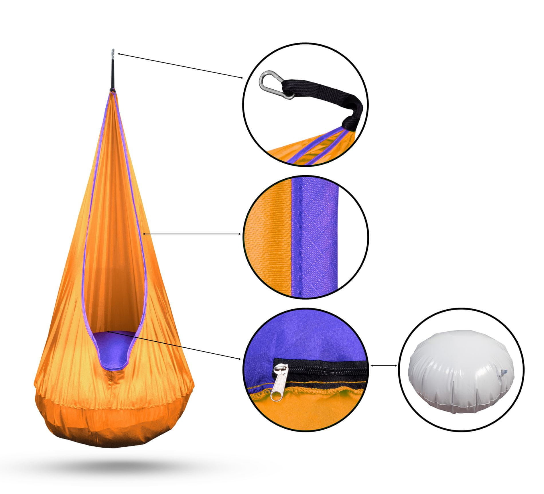 Aga viseča vreča, ki je narejena iz močne tkanine, sedež pa je mehak, udoben vzglavnik s premerom 70 cm.