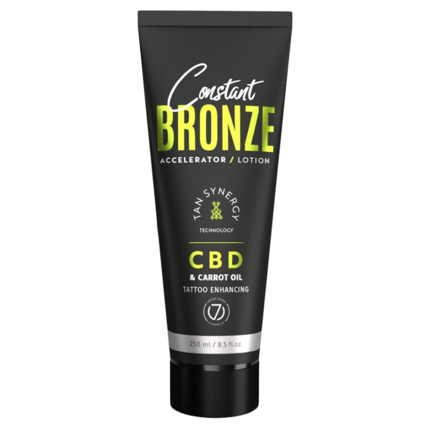 7suns Constant Bronze CBD & Losjon za pospeševanje porjavitve korenčkovega olja 250 ml Synergy Technology – 3-v-1. Ta tehnologija, ki je bila prvič predstavljena v seriji Constant Bronze, združuje tri sestavine: UV žarke, kompleks sestavin, ki spodbujajo naravno melanogenezo (pigmentacijo kože). Kompleks, uporabljen v tem izdelku, smo poimenovali MelanoBlend IONS—biomimetična, aktivna kombinacija tirozinskih, magnezijevih in manganovih ionov ter inovativna mešanica emolientov (še bolj učinkovito prenaša aktivne sestavine v kožo). Ti trije elementi skupaj dosežejo največ! Globlja in dolgotrajnejša porjavelost kot kdaj koli prej. Moč porjavitve: 150X. Najljubši duo ljubiteljev sončenja: CBD in korenčkovo olje. Ta losjon za porjavitev s CBD-jem in korenčkovim oljem morate imeti v vsakem sodobnem solariju – absolutni #musthave! Zakaj kupci obožujejo te sestavine in jim zaupajo? Konopljino olje – intenzivno vlaži in neguje kožo. Gladi in ji vrača elastičnost ter preprečuje nastajanje gub. Bogat je s tokoferoli in karotenoidi, ki so odgovorni za antioksidativne lastnosti in pigmentacijo kože. Korenčkovo olje – vir betakarotena, ki poskrbi za dolgotrajno potemnetev kože. Tan se gradi postopoma, a na trdnih, premišljenih temeljih. Globinsko nahranjena in navlažena koža pridobi zdrav, lep ten. Po nekaj sončenju s Constant Bronze pospeševalnikom je polt videti spočita, kot bi se vrnila z dopusta! Sreča je zelena. Nihče ne bo ostal ravnodušen ob tem edinstvenem, lahkem balzamu iz limete! Vesel vonj lubenice, rabarbare, breskve in hibiskusa zagotavlja dvig razpoloženja ob vsakem nanosu. Dišava: eksotična in sadna. Barva balzama: svetlo zelena. Nova globina barve za tetovaže. Vsebuje kompleks TATTOO ENHANCING. To je lastniška mešanica emolientov in olj za nego tetovaže, ki poudari barvo.