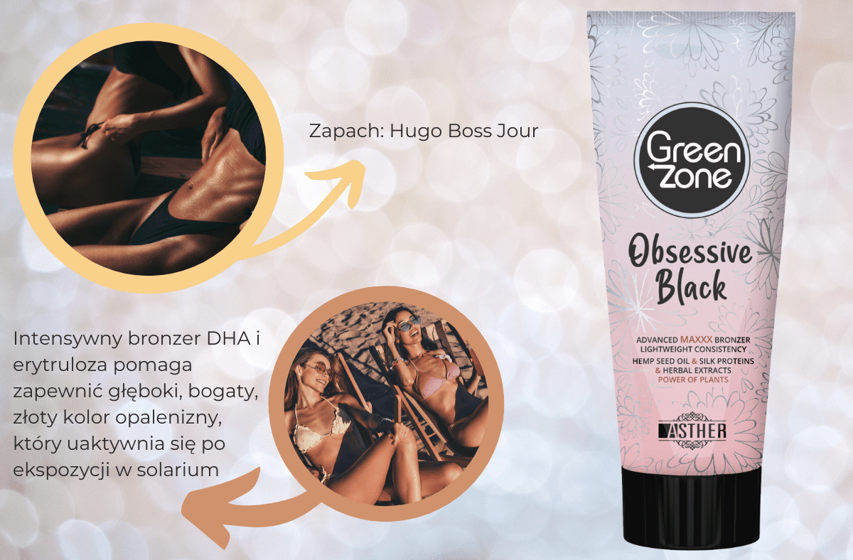 Asther Green Zone Obsessive Black Intense Bronzer 200 ml. Ta intenzivni bronzer z DHA in eritrulozo pomaga zagotoviti globoko, bogato zlato porjavelost, ki se razvije po izpostavitvi soncu. Bogata mešanica rastlinskih izvlečkov (Centella Asiatica, hamamelis, limona, bor, rožmarin, žajbelj) in kolagena daje koži mladosten videz. Dišava: Hugo Boss Jour. Kapaciteta: 200 ml.