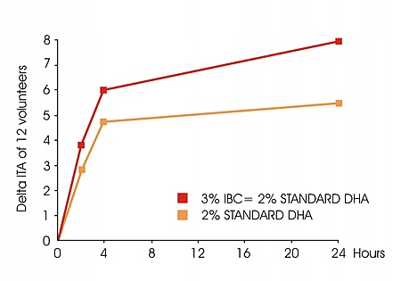 Razlike v učinkovitosti IBC in Standard DHA skozi čas so predstavljene v spodnjem grafu.