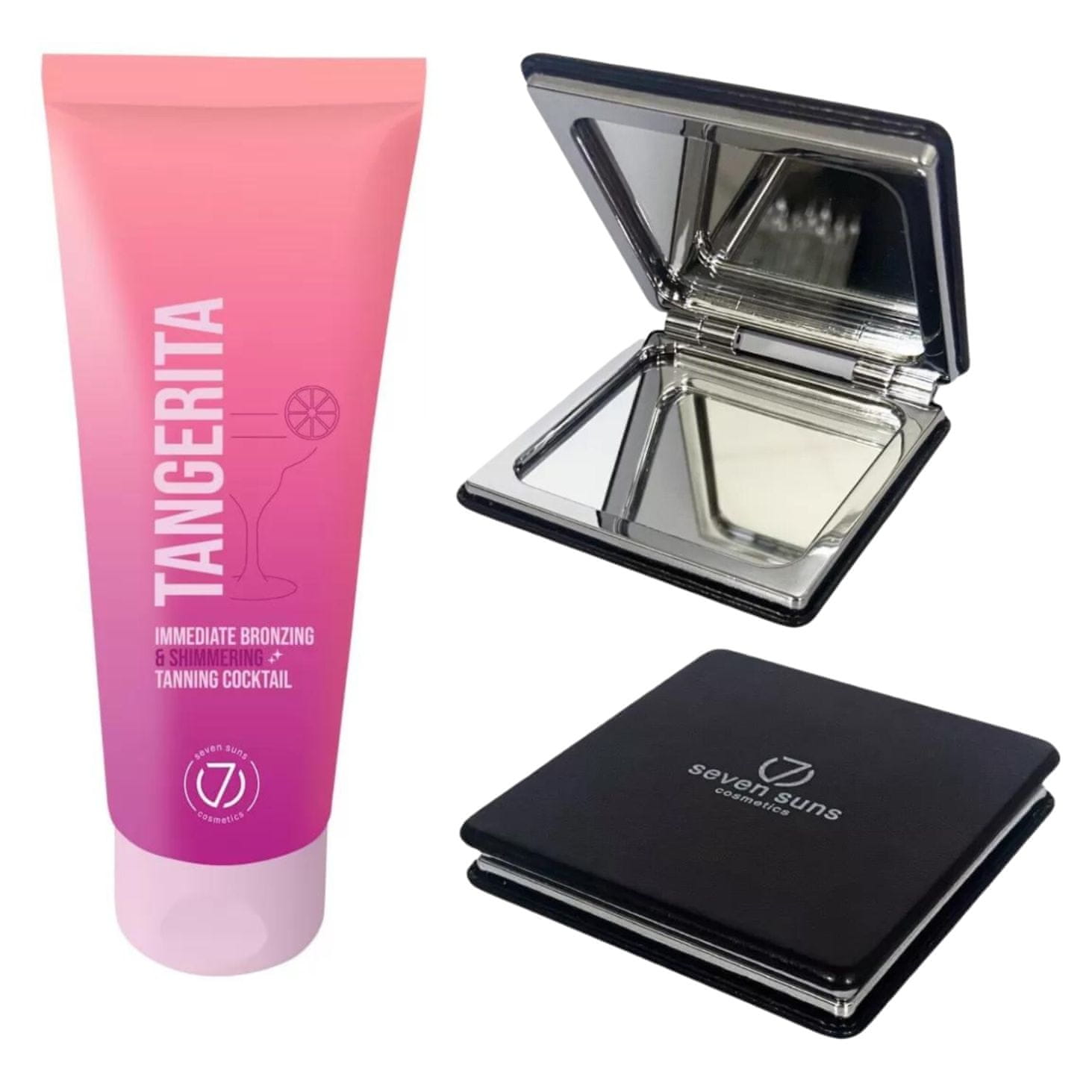 Koktajl za porjavitev 7suns Tangerita z bronzerjem in svetlečimi delci 100 ml + brezplačno dvojno ogledalo 7suns Tangerita koktajl za porjavitev z bronzerjem in svetlečimi delci 100 ml Ta vabljivo lesketajoča formula bo zagotovo pritegnila pozornost (tako kot njen izvirnik »M«). Formula vključuje izvleček pomaranče (z izjemno močnimi antioksidativnimi lastnostmi) in kompleks na osnovi mineralnih učinkovin (ki podpira procese dobrega staranja in ščiti kožo pred onesnaženostjo v zaprtih prostorih, kot je cigaretni dim). Skrivnost zlatega prahu Sijaj zlatih delcev je očarljiv, nevsiljiv in eleganten. Čez dan se bo zlati prah veselo lesketal v sončni svetlobi. In zvečer bo vsako obleko spremenila v obleko za zabavo! Kljub bogati sestavi se bronzer hitro vpije in ne obarva oblačil. Kako Tangerita pospešuje porjavelost? Biomimetični, aktivni kompleks Melanoblend TYR, ki temelji na tirozinu, je odgovoren za učinek intenziviranja porjavelosti. Vonj in barva, ki bosta očarala. Svetleč, svetlo rjav odtenek mase in presenetljiva aroma sta suha in zanimiva. Na začetku so opazne zgornje note pomaranče, jagode, jabolka in vina. Srčne note so črni ribez in malina. Osnovo dišave tvori suho sadje. Popoln za potovanja in počitnice. Ali vaše stranke težko porabijo polno 250 ml tubo losjona? Ali uživajo v pogostih spremembah in novostih? Ali morda iščejo lahek kozmetični izdelek, ki bi ga lahko vrgli v torbo za na plažo ali celo v ročno prtljago na letalu? Novost v naši panogi – 100 ml embalaža – je popolna za vse te situacije! Tudi embalaža je primerna za recikliranje. Kako in kdaj uporabiti Tangerito? Najbolje ga je nanesti tik pred sončenjem. Prvi rezultati bodo vidni takoj: vaša koža bo rahlo porjavela, pridobila bo zdrav ton in čudovit sijaj (zahvaljujoč svetlečim delcem). Rezultati se bodo poglabljali še dolgo po končani seji. Popoln je tudi za uporabo med tretmaji kot balzam za hranjenje in izboljšanje videza vaše kože. POMEMBNO: Takoj po nanosu bronzerja priporočamo, da si roke osušite z robčkom. Da preprečite razbarvanje kože, si po vsaki seji roke in nohte temeljito umijte s toplo vodo z milom. 7suns Dvojno ogledalo z logotipom: Valjajoča se podlaga, razmazana šminka, ki odseva maskaro na vaši veki … toliko stvari se lahko zgodi. Želite imeti vse pod nadzorom? Vrzite to majhno ogledalo v torbico, žep ali nahrbtnik. Zahvaljujoč robustni konstrukciji bo zanesljiv spremljevalec zelo dolgo časa.