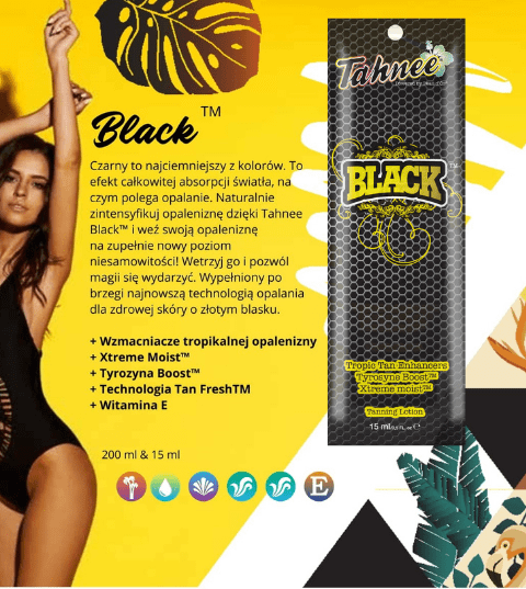 Črna je najtemnejša barva. Je rezultat popolne absorpcije svetlobe, kar je bistvo porjavitve. Naravno okrepite vašo porjavelost s Tahnee Black™ in ponesite svojo porjavelost na popolnoma novo raven osupljivosti! Vtrite in pustite, da se zgodi čarovnija. Poln najnovejše tehnologije porjavitve za zdravo kožo z zlatim sijajem.