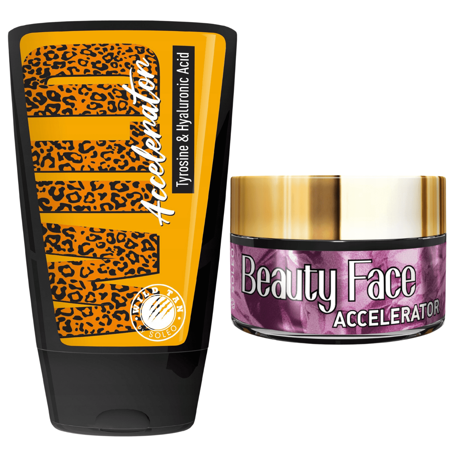 Wild Tan Wild Accelerator s hialuronsko kislino + Beauty Face Jar Wild Tan Wild Accelerator s hialuronsko kislino 125 ml Losjon za porjavitev s hitrim vlažilnim in porjavelim učinkom. Hialuronska kislina izboljša teksturo kože, zagotavlja intenzivno hidracijo in ravnovesje. Dišava: Hawaiian flower Kapaciteta: 125ml Soleo Beauty Face Accelerator Beauty face pospeševalnik je intenzivno vlažilni pospeševalnik porjavelosti obraza, vratu in dekolteja s kolagenom. Mešanica sestavin proti staranju in pomirjujočih sestavin naredi kožo sijočo in mladostno. Lepota obraza spodbuja naravni proces melanogeneze in podaljšuje porjavelost. Hitro se vpije, koža pa ostane prožna, navlažena in lepa. Dišava: roza cvetovi Kapaciteta: 15 ml Sestavine Tirozin – pospešuje porjavelost Izvleček aloje in kamilice – intenzivno vlažita in pomirjata Kolagen regenerira in elastizira kožo, deluje proti staranju