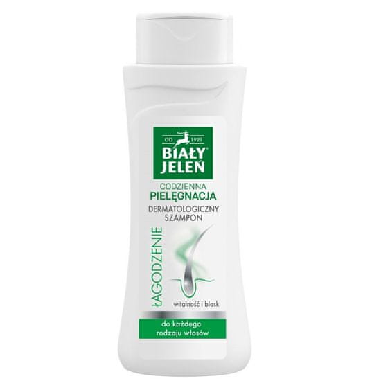 Dermatološki šampon Biały Jeleń nežno, a učinkovito očisti lase in lasišče. Zgladi lase in vidno izboljša stanje lasišča, odpravlja občutek nelagodja, srbenje in morebitno razdraženost. Obnavlja strukturo las, jim vrača sijaj in zdrav videz. Dodatno olajša razčesavanje las: • aktivni pšenični hidrolizat • pomirjujoč in pomirjujoč polimer Izdelek dobro prenašajo ljudje z občutljivo kožo, nagnjeno k atopiji, Cocamidopropyl Betaine, Sodium C14-C16 Olefin Sulfonate. lauroil sarkozinat, decil glukozid, koko-glukozid, Gliceril oleat, pantenol, alantoin, polikvaternij-10, laurdimonijev hidroksipropil hidroliziran pšenični protein, laurdimonijev hidroksipropil hidroliziran pšenični škrob, PEG/PPG-120/10 trimetilolpropan trioleat, lauret-2, citronska kislina, natrijev benzoat, fenoksietanol, tetranatrijev EDTA , parfum.