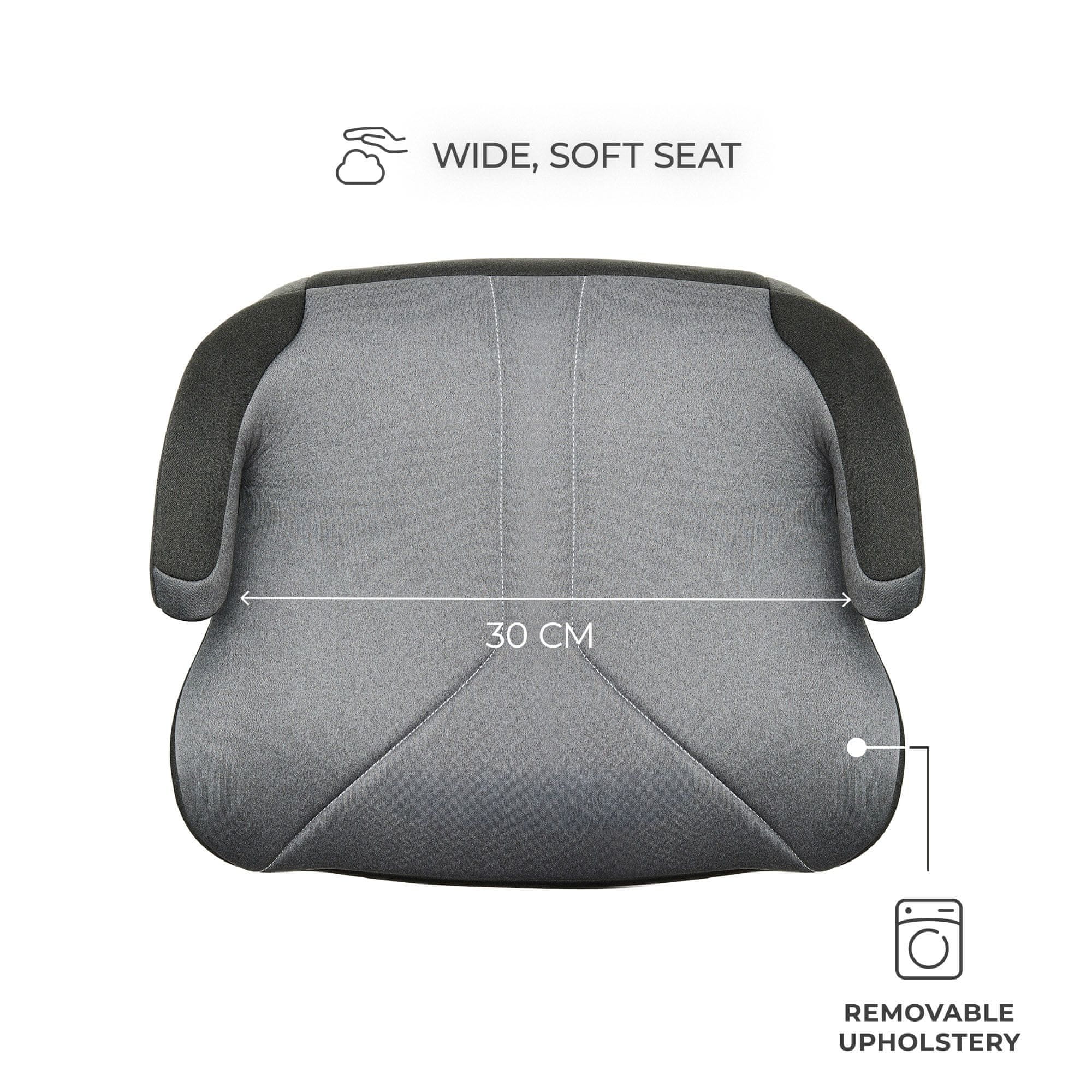 Širok sedež z mehkim penastim polnilom omogoča udobno sedenje tudi na daljših poteh, medtem ko ergonomsko oblikovani nasloni za roke in vgrajena vodila za varnostni pas skrbijo za pravilno ter stabilno namestitev otroka v vozilo.