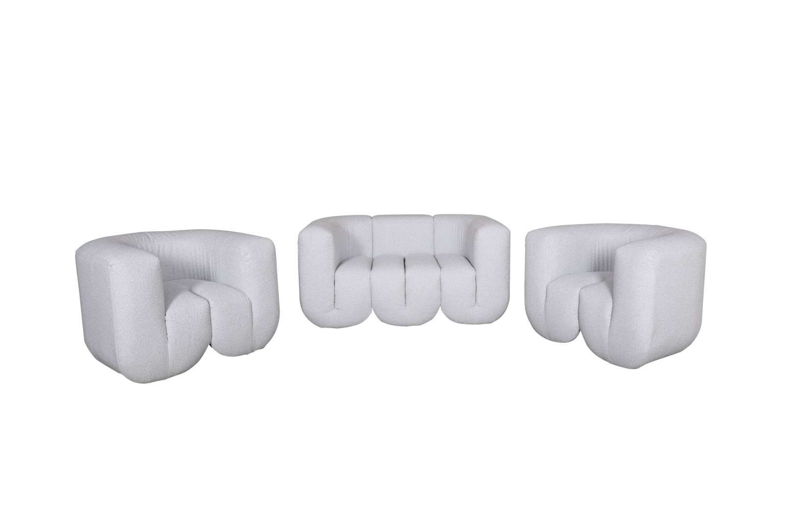 Ta sodobna sedežna garnitura se ponaša z edinstveno ukrivljeno zasnovo in mehko oblazinjenjem iz šenila, zaradi česar je stilsko središče vsakega bivalnega prostora. Njena sodobna oblika zagotavlja udobje in vizualno privlačnost, popolna za popestritev vašega domačega dekorja. Celoten opis