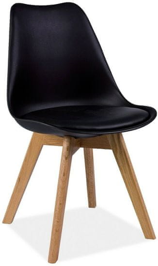 Zelo sodoben, eleganten stol v retro slogu z ergonomsko obliko. Podnožje je izdelano iz lesa hrastove barve, naslonjalo pa iz plastike PP (kratica PP – amorfni termoplastični industrijski kopolimer, ki je odporen na mehanske poškodbe. Trden, žilav, odporen na nizke in visoke temperature, nizko vpijanje vode, ni škodljiv za zdravje. Odporen je na kisline, alkalije, ogljikovodike, olja in maščobe.) Oblazinjenje sedeža je prevlečeno z eko usnjem v črni barvi. Stol se prilega mizam, ki jih najdete v naši ponudbi.