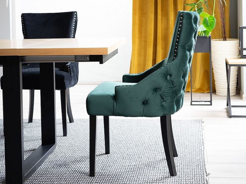 Privlačen, zelo udoben oblazinjen stol – fotelj v modernem slogu glamur. Noge so izdelane iz lesa v črni barvi, oblazinjenje sedeža pa iz oblazinjene tkanine BLUVEL AKSAMIT v zeleni barvi. Kovinski okraski po obodu in elegantni šivi na hrbtišču stola so še bolj razkošni. Celoten opis