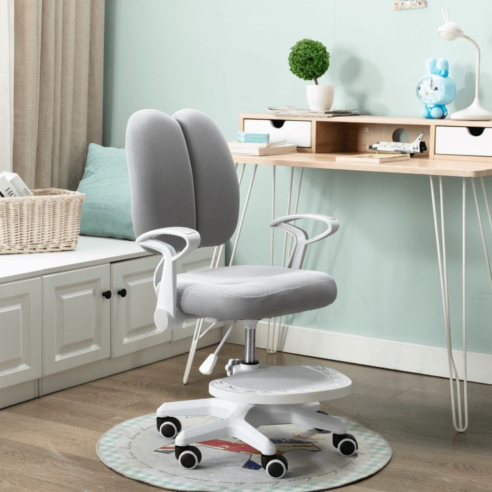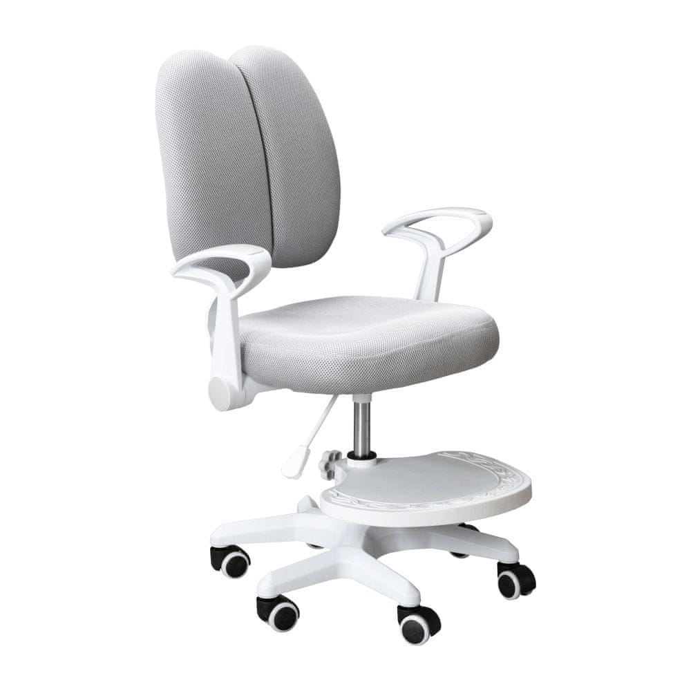 Otroški stol s stolčkom in ANAIS nosilci na koleščkih bo odlična motivacija za male šolarje. S tem ergonomskim stolom učenje postane igra in vsak starš bo zadovoljen, da je za svojega otroka izbral najboljše. Ta praktični rastoči stol se popolnoma prilagodi vsakemu študentu. Njegova prednost ni le praktičnost, temveč tudi udobje, dizajn in večnamenskost. Ni vam treba skrbeti, da bo vaš otrok zrasel iz stola, saj ima funkcijo nastavitve višine in globine sedeža. Nasloni za roke, ki jih je mogoče zložiti, zagotavljajo oporo utrujenim rokam in varnost. Druga prednost je opora za noge za manjše otroke, ki je nastavljiva po višini in snemljiva. Varnostni trakovi, ki zagotavljajo pravilno držo telesa, so absolutno obvezna oprema. Stabilnost stola zagotavlja plastična vrtnica s šestimi koleščki, ki so primerna tako za lesena kot lebdeča tla. Sivo-bela barvna shema se popolnoma prilega tako dekliški kot fantovski sobi. Stol je oblazinjen s sivo mrežico, skupne dimenzije (ŠxGxV): 58×55×83–89–102 cm, višina sedišča 47–60 cm, širina sedišča 45 cm, naslonjalo za hrbet je dimenzij (ŠxV): 40×39 cm, njegova nosilnost pa 90 kg.