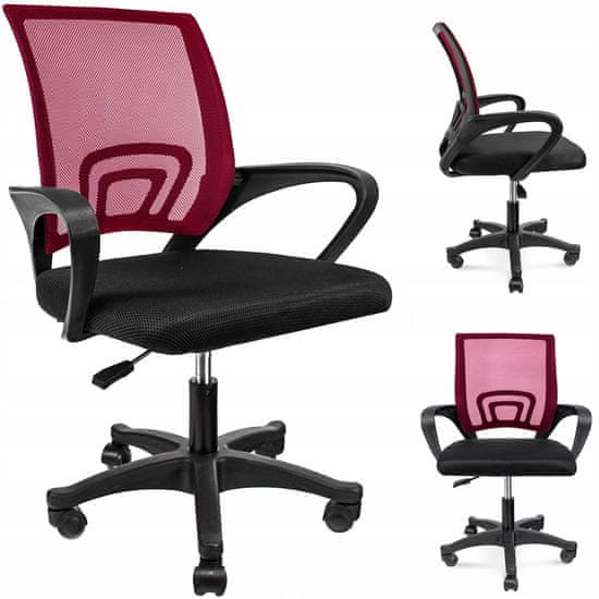 Vrtljiv stol "SMART"CM-354401 Stol SMART je črn vrtljiv stol, ki združuje funkcionalnost s sodobno obliko. Popolnoma oblikovan naslon v kombinaciji z mehkim sedežem zagotavlja veliko udobje, stabilno podnožje s petimi zvezdicami, zaključeno z majhnimi plastičnimi kolesi, pa zagotavlja odlično stabilnost in ščiti površino pred praskami. Stol ima pogon, ki omogoča prilagajanje višine sedeža Barva: črna/bordo. Ponudba je za en kos. Specifikacija: Višina pohištva: 91 cm Širina pohištva: 64 cm Globina pohištva: 54 cm Največja višina sedeža: 43 cm Najmanjša višina sedeža: 33 cm Širina sedeža: 48 cm Globina sedeža: 49 cm Največja obremenitev: 110 kg