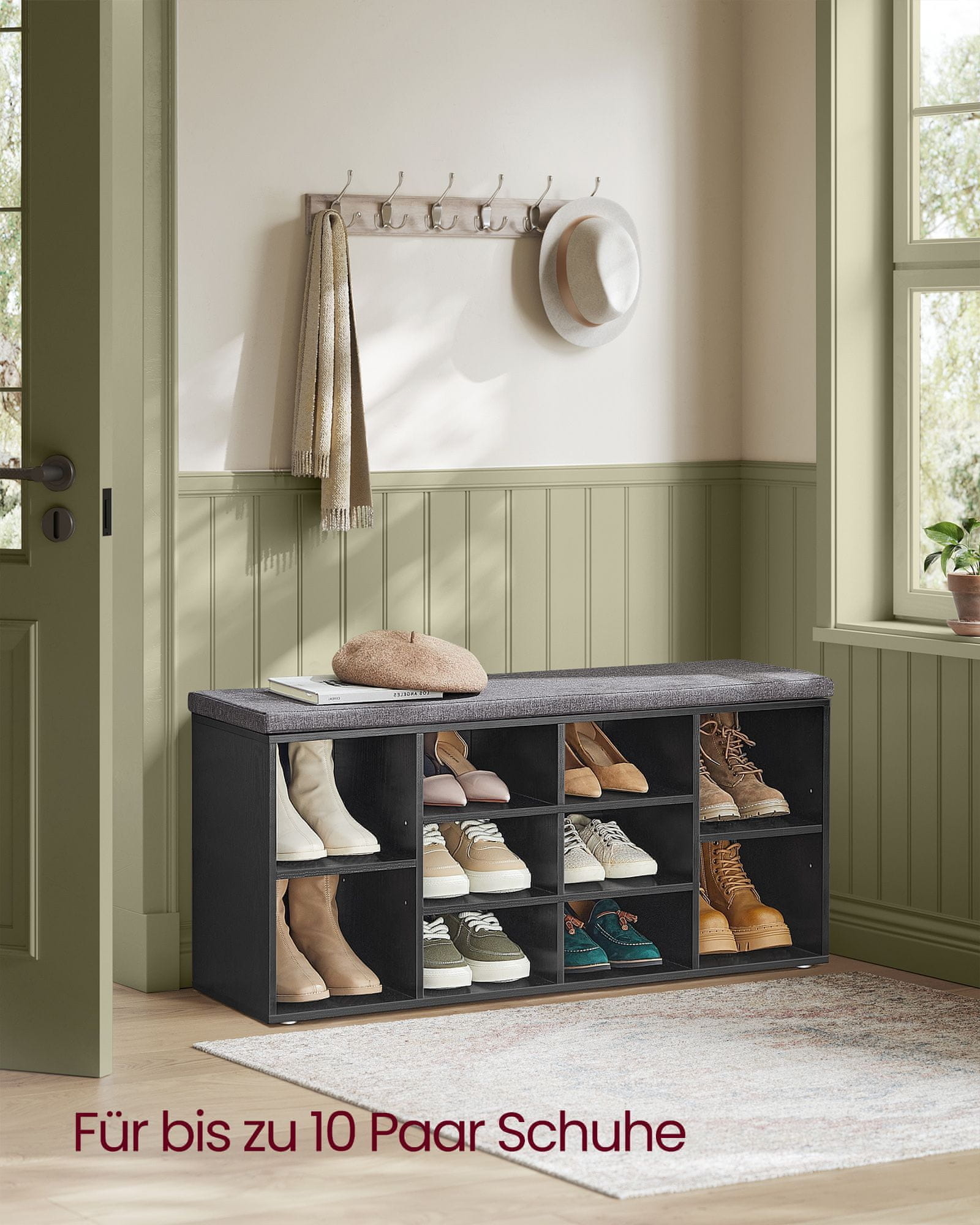 Ta praktičen čevljarski stol ponuja udoben sedež in veliko prostora za shranjevanje zaradi česar je idealen za organizacijo čevljev in dodatkov v hodniku ali dnevni sobi. Njegova vsestranska zasnova vključuje več predelkov in oblazinjeno sedišče ki zagotavljata tako funkcionalnost kot udobje. Elegantna podoba se brezhibno zlije z različnimi notranjimi slogi.