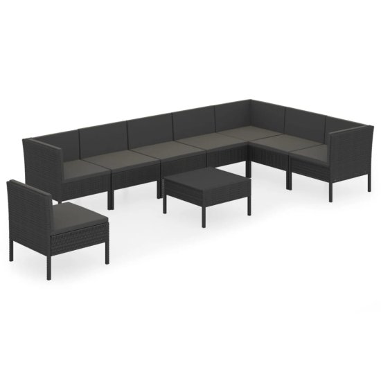 Vidaxl Vrtna sedežna garnitura 9-delna z blazinami poli ratan črna