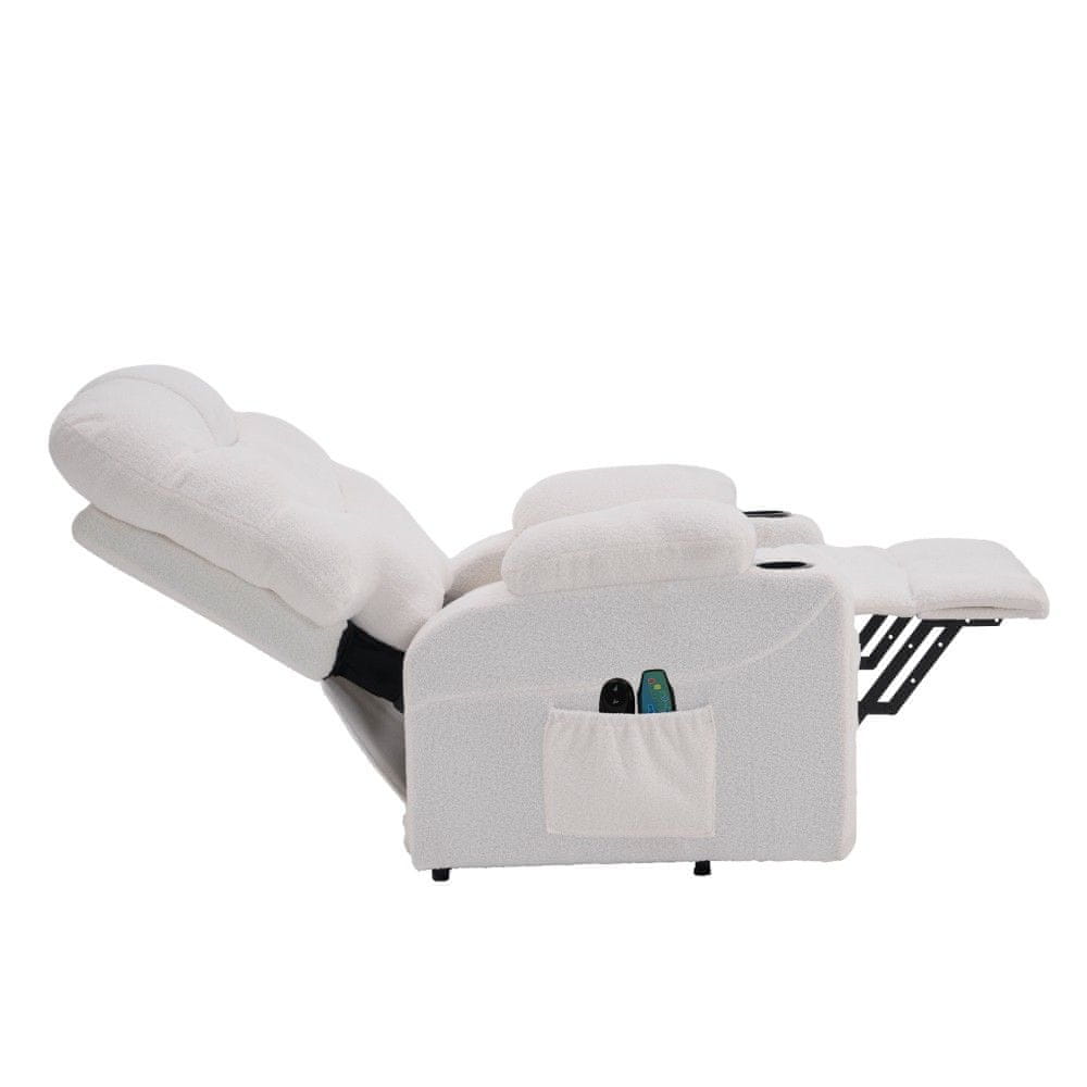 Uživajte v sprostitvi po napornem dnevu v polohljivem stolu HUDSON, ki združuje moderno obliko z maksimalnim udobjem in funkcionalnostjo. Stol je oblazinjen z belo tkanino Bouclé z odpornostjo proti obrabi 45.000 ciklov po testu Martindale in ima trdno jekleno ogrodje. Udobno polnilo je pena z visoko gostoto 240D. Zahvaljujoč električni funkciji dvigovanja stol olajša vstajanje, kar bodo cenili predvsem seniorji. S pomočjo mehanizma lahko gladko polohujete podnožje in naslonjalo v sproščujoč položaj po potrebi. Masažna funkcija s 6 vibracijskimi točkami ponuja 8 načinov in 3 stopnje intenzivnosti, časovnik pa omogoča nastavitev masaže na 15 ali 30 minut za popolno sprostitev. Stol Hudson je opremljen s praktičnimi stranskimi žepi in držali za pijačo, da imate vse potrebno vedno pri roki. Dimenzije stola so 87×97/155×80/108 cm, višina sedišča 49 cm, globina in širina sedišča 56 cm, hrbtno naslonjalo ima 70 cm višine in 79 cm širine. Nosilnost stola je 150 kg. Upravljanje vseh funkcij zagotavlja daljinski upravljalnik. Napajanje je preko 2,5 m omrežnega kabla z napetostjo 100 – 240 V. Stol je dobavljen v razstavljenem stanju in je idealna izbira za vsakodnevno udobje, sprostitev in regeneracijo.
