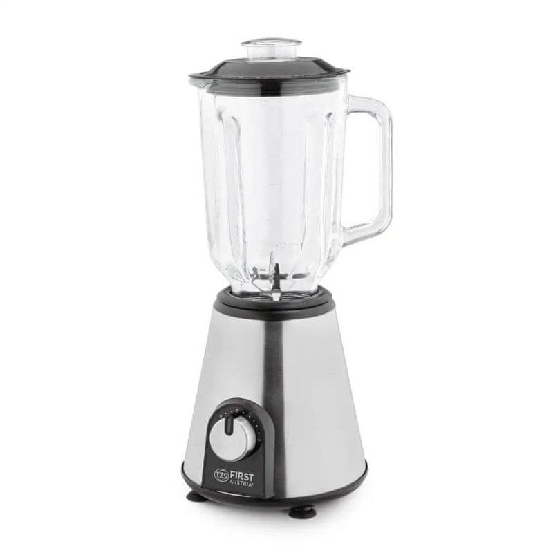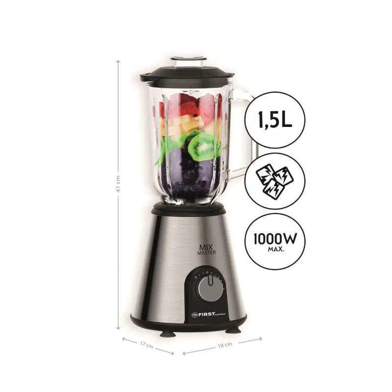 First Austria pokončni mešalnik deluje z močjo 1000 W in je primeren za drobljenje ledu, mešanje delčkov zelenjave, pripravo slastnih smutijev ali mletje kavnih zrn. Ima stekleno posodo s prostornino 1,5 litra, ki je primerna za pomivanje v pomivalnem stroju. Mešalnik ima 2 hitrosti delovanja in dodaten gumb za funkcijo pulziranja. Kompaktna in lahka oblika omogoča enostavno shranjevanje, medtem ko sistem varnostnega zaklepa zagotavlja varno uporabo.