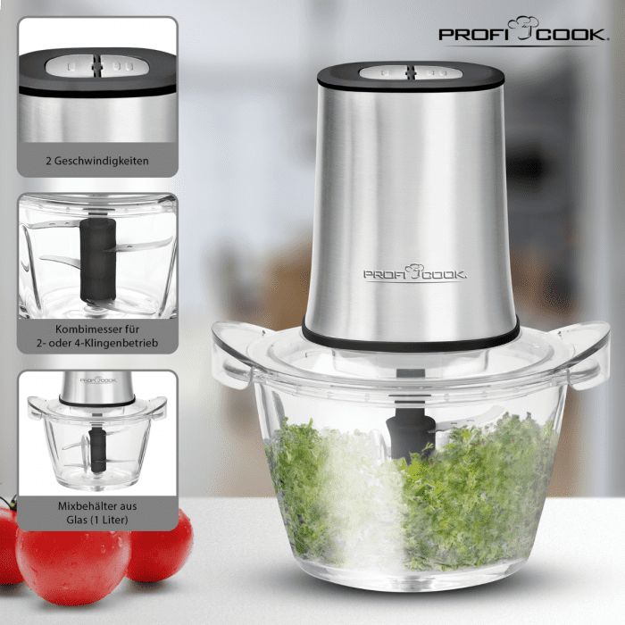 Univerzalni sekljalnik 2 v 1 ProfiCook MZ 1150 je zasnovan za hitro sekljanje in mešanje. Steklena posoda s prostornino 1000 ml je primerna za uporabo v mikrovalovni pečici in pomivalnem stroju. Za sekljanje poskrbita 2 odstranljiva rezila iz nerjavečega jekla. Na voljo je tudi kombinirani nož z 2 a Celoten opis