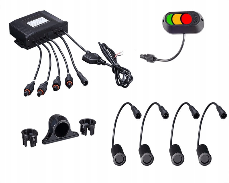 Sistem je sestavljen iz krmilne enote, LED indikatorja, brenčala, kablov in 4 ultrazvočnih senzorjev.