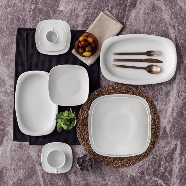 Set krožnikov, skled in skodelic iz linije Mimoza predstavlja krasen preplet med tradicionalno elegantnostjo bele barve in nekoliko bolj nevsakdanjo oglato obliko. Set, ki je zaznamovan s kvadrati ter ravnimi stranicami, bo poskrbel, da bo vaša postrežba nekoliko drugačna od tistih klasičnih.