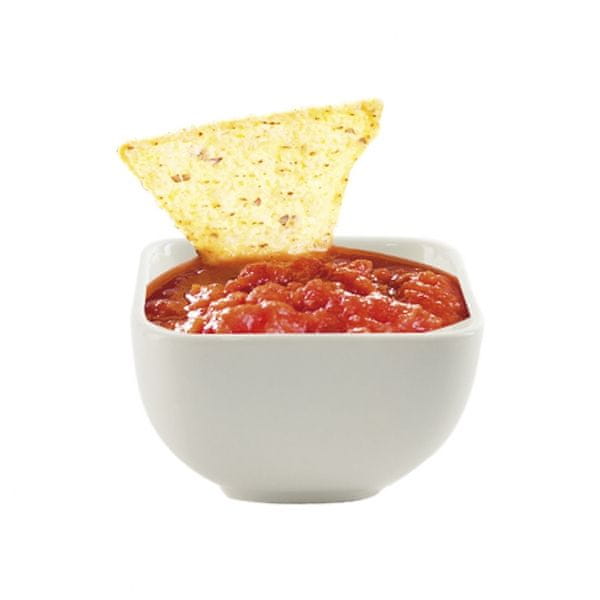 Bela porcelanska kvadratna skleda. Zagotavlja prijetno serviranje oliv, oreščkov, zelenjave ali različnih omak in prelivov za meso na žaru. Primerno tudi za sladke mini sladice. Dimenzije 8 × 8 × 5 cm. EAN 8592381127602