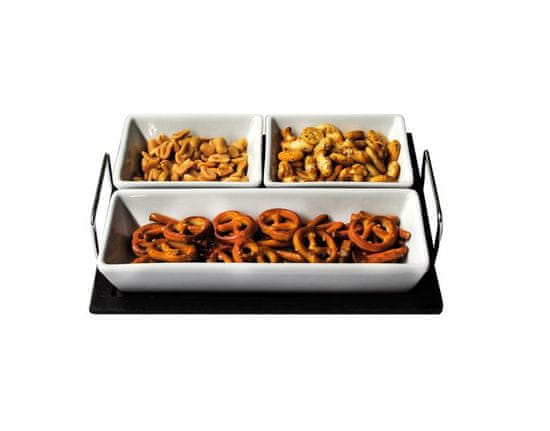 Zelo priljubljen komplet treh skled na lesenem pladnju je zelo praktičen pri serviranju različnih jedi, zavihki iz nerjavečega jekla na straneh pladnja pa zagotavljajo enostavno rokovanje. Sklede je mogoče pomivati v pomivalnem stroju, pladenj pa je enostaven za pranje, samo obrišite ga z vlažno krpo. Material – keramika, les, nerjaveče jeklo. Velikost pladnja – 19 × 22, 8 cm. Velikost manjših skodelic – 8, 4 × 10, 3 × 3, 3 cm, prostornina 100 ml.