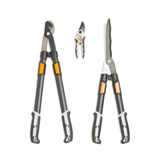 Set za obrezovanje vključuje škarje, obrezovalnik in rezalnik. Izdelan iz plastike, aluminija in nerjavečega jekla. Dimenzije: 71,5 × 29 × 8 cm. Celoten opis