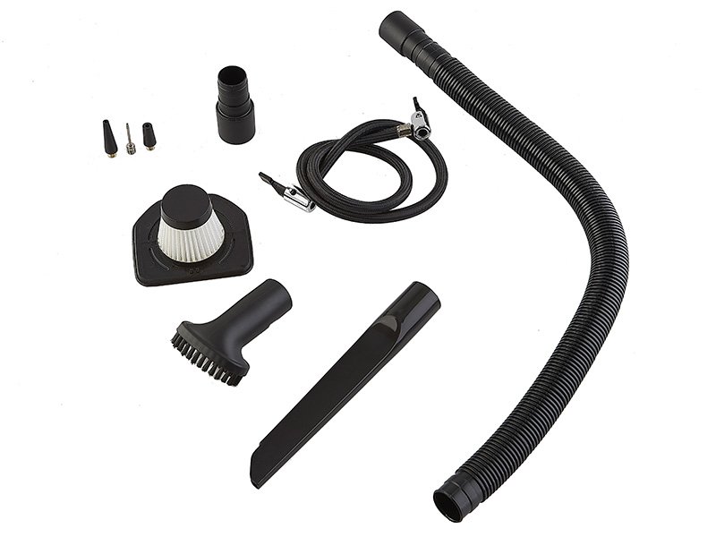 – priložena sta 2 filtra HEPA – 12V napajalnik – moč 80 W – komplet 2 izmenljivih nastavkov za sesanje + 39 cm cev – črpalni kabel za kompresor – komplet 3 črpalnih nastavkov – praktična torba za shranjevanje kompleta – majhna in priročna<