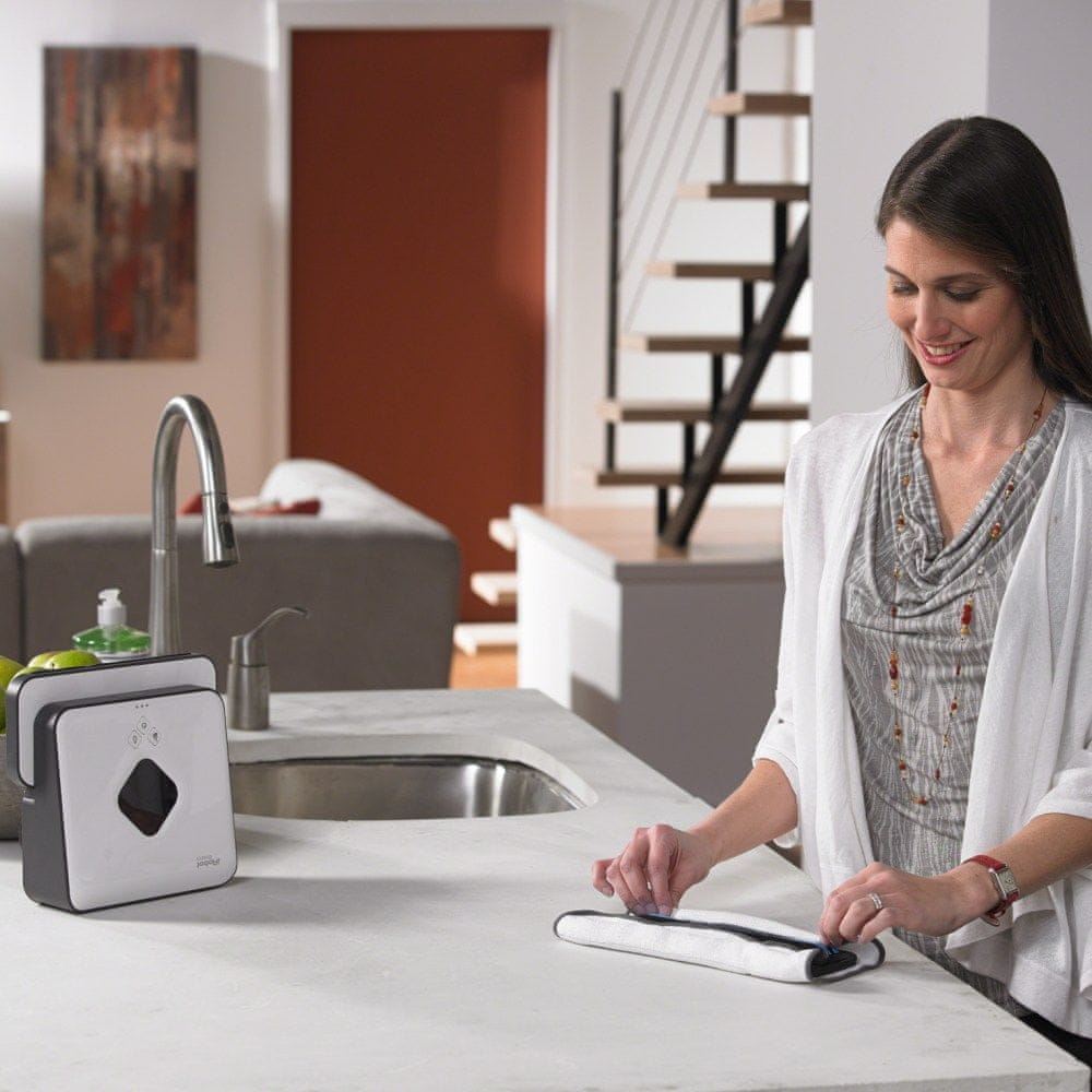 Z Braava 390t lahko tla preprosto pomijete ali pometete. Izberite mokro krpo za vsakodnevno brisanje umazanije in madežev ali suho krpo za učinkovito pometanje prahu, umazanije, las in alergenov.