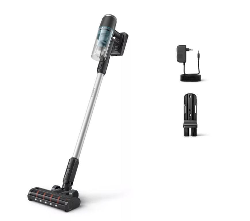 Brezžični sesalnik nudi temeljito čiščenje vašega doma. Zmogljiva tehnologija PowerCyclone 8 zagotavlja optimalno pobiranje prahu z minimalno porabo baterije. Fini prah in umazanija ostaneta zaprta v notranjosti zahvaljujoč trem izredno finim filtrom. Natančna krtača je zasnovana tako, da sega 1 mm do sten in s tem natančno posesa vse delce umazanije. Poleg tega pa ima LED lučke, ki osvetlijo umazanijo, da ujamete vsak delček. Zmogljiva Li-Ion baterija nudi do 60 minut čiščenja v običajnem načinu in 15 minut v turbo načinu. Baterijo lahko za namene polnjenja snamete, ob dokupu dodatne baterije pa ju lahko preprosto zamenjate za neprekinjeno delovanje. Sesalnik lahko tudi pretvorite v ročni sesalnik in z njim očistite dvignjeno pohištvo ali celo vozilo.