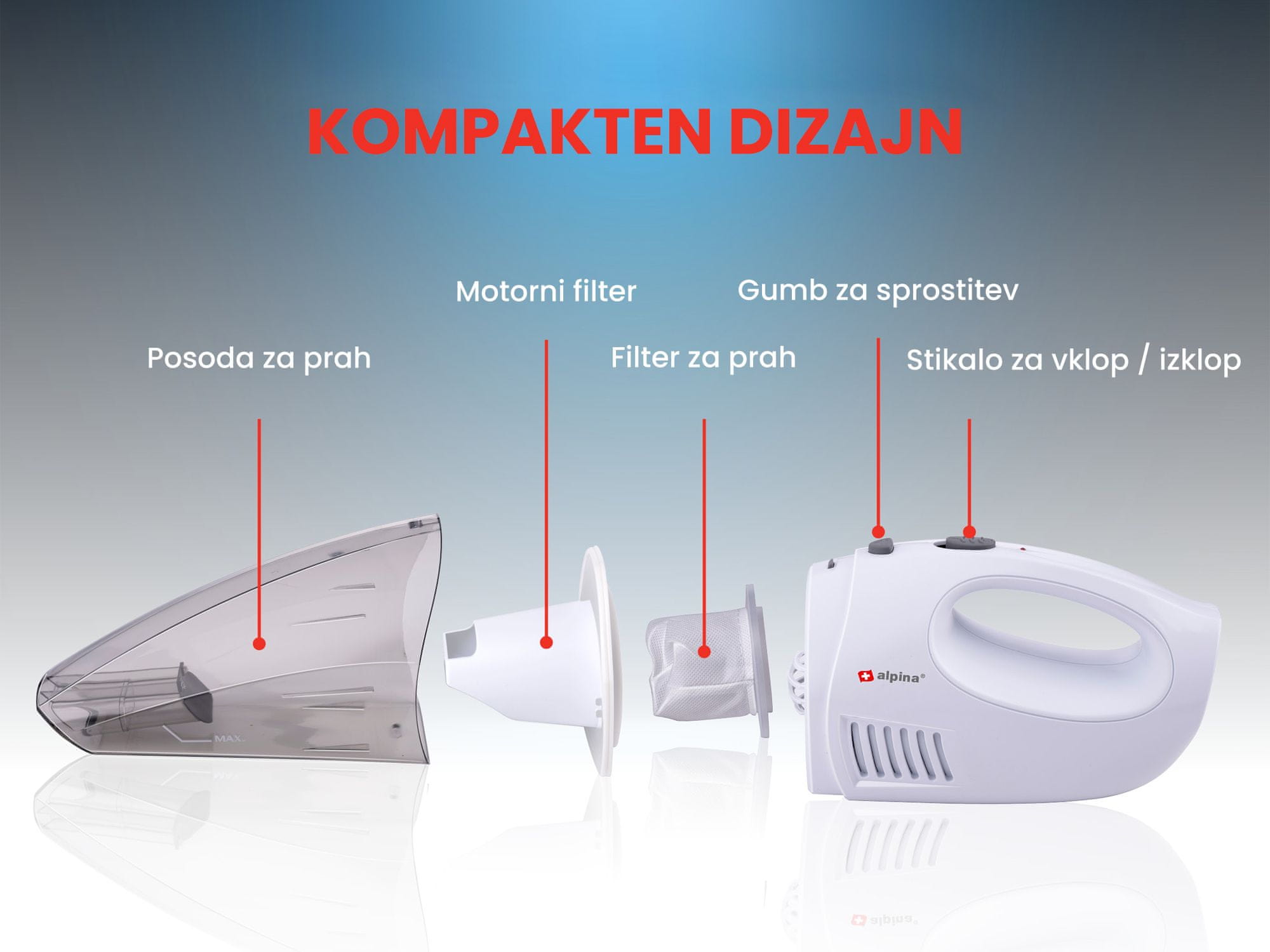 Alpina ročni sesalec, 1,6 kPa, 30 W, 4,8 V, 500 ml, polnilna baterija, bel