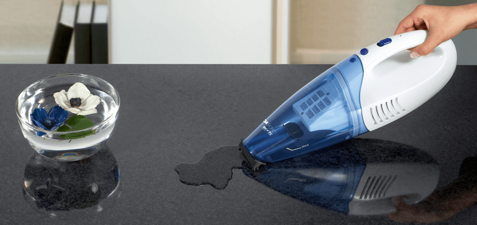 Praktičen ročni baterijski sesalnik proizvajalca Clatronic s pralnim filtrom.