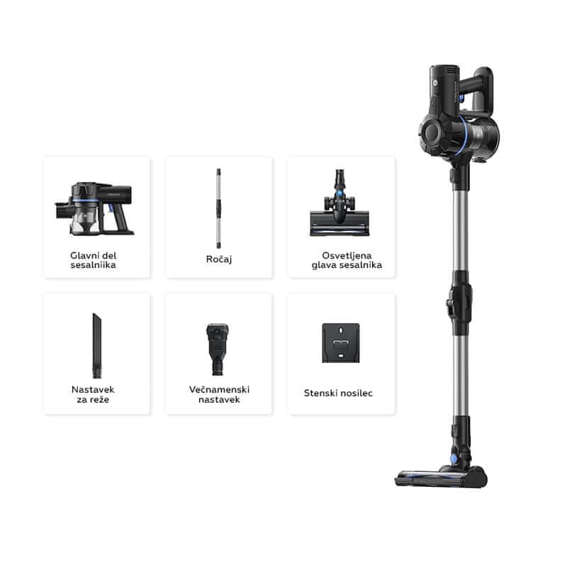 - Močan baterijski paket – do 35 minut sesanja s konstantno in močno sesalno zmogljivostjo, zahvaljujoč baterijskemu paketu baterij 4× 2200 mAh