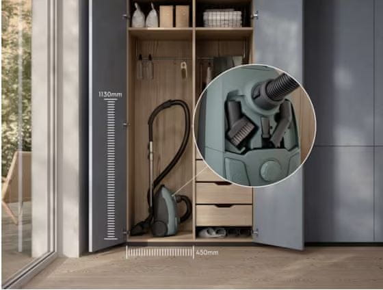 Kompaktna velikost sesalnika zagotavlja primernost za vsak dom, dodatna oprema pa je priročno shranjena, tako da imate vse, kar potrebujete, vedno pri roki.